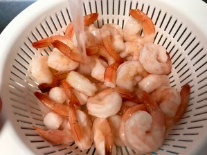 Before making the sauce mixture, I throw the frozen shrimp into a colander (aka pasta drainer), and run it under room temperature water for a minute or so to start defrosting it.