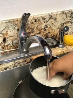 - Fill water enough so that when you place hand in pot (see picture in blog), water is right below knuckles. (Or you can just follow the instructions on the rice bag to see the ratio of water to rice)
