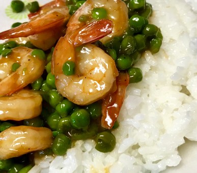 SWEET AND SPICY STICKY SHRIMP AND PEAS