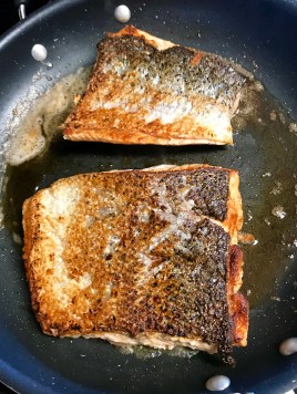 - Flip salmon (salmon skin should be very crispy). Cook salmon for another minute or two.