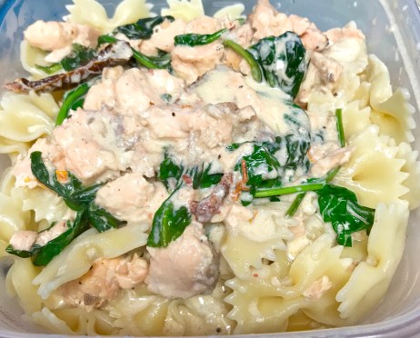 Add spinach! The original recipe called for chopped spinach, but I just threw in bagged spinach I bought. Mix the spinach into the sauce until spinach is cooked in.