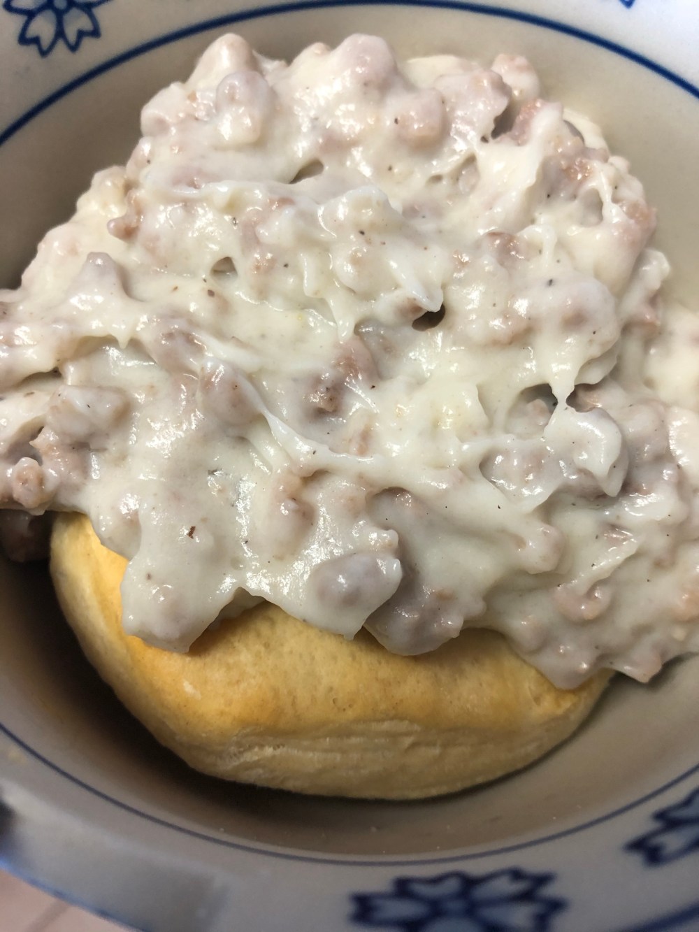 - Once the biscuits are out of the oven, everything’s ready! Just make yourself a plate and pour the sausage gravy over your biscuits 🙂