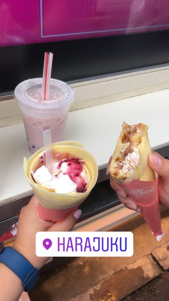 Harajuku is not only filled with crowds of people, and girls dressed like anime dolls, but lots of crepe places too! Japanese crepes are so good so we had to get some to snack on 🙂
