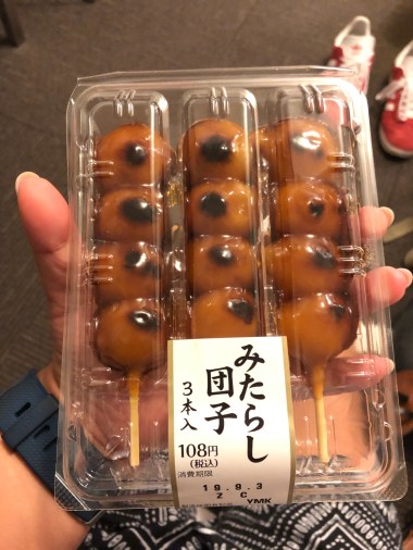 Mitarashi dango! Pieces of mochi in a sweet and savory shoyu (soy) sauce. We have these back in Hawaii, but since we were in Japan, I couldn’t resist haha.